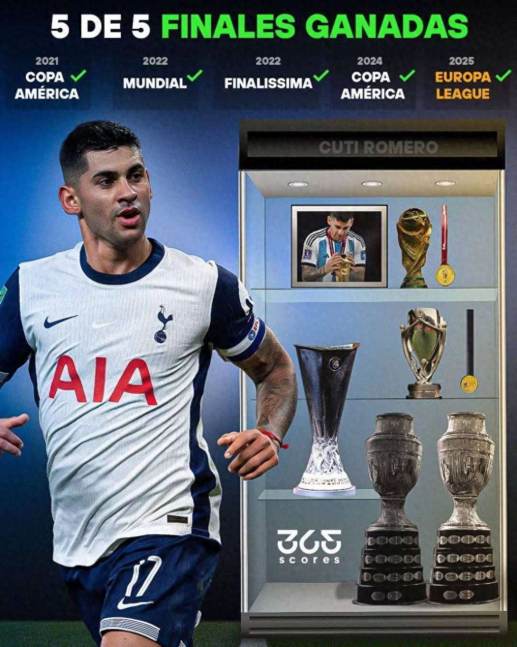 2025年欧联杯决赛,热刺1-0曼联,罗梅罗打满了全场!2024年美洲杯决赛,阿根廷加时1-0哥伦比亚,罗梅罗打满了全场!2022年世界杯决赛,阿根廷点球大战7-5法国,罗梅罗打满了全场!2022年欧美杯,阿根廷3-0意大利,罗梅罗首发出战85分钟。2021年美洲杯决赛,阿根廷1-0巴西,罗梅罗首发出战79分钟。
