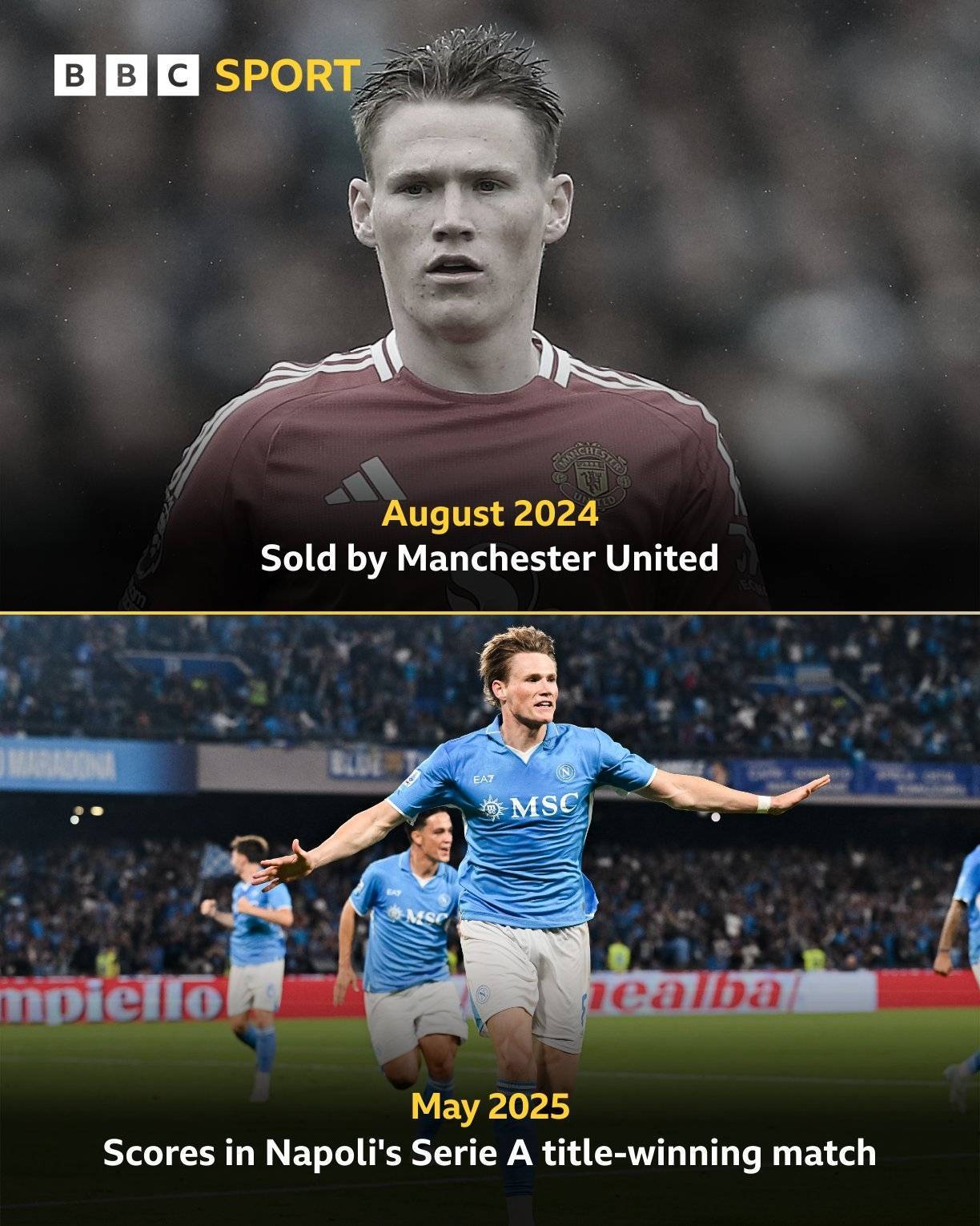 然而9个月过后,两名球员的境遇已经截然不同,麦克托米奈如今随那不勒斯庆祝意甲夺冠。而乌加特则在欧联杯决赛曼联0-1热刺的比赛中没有捞到1分钟的出场时间。